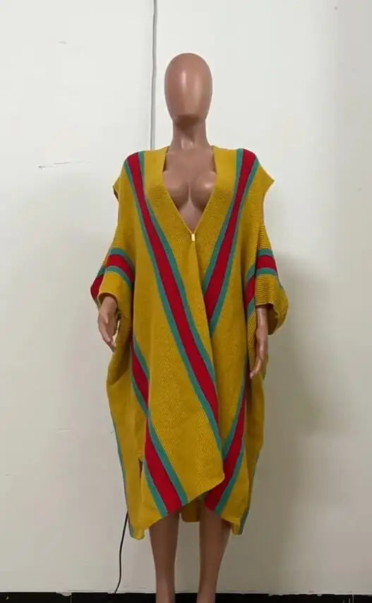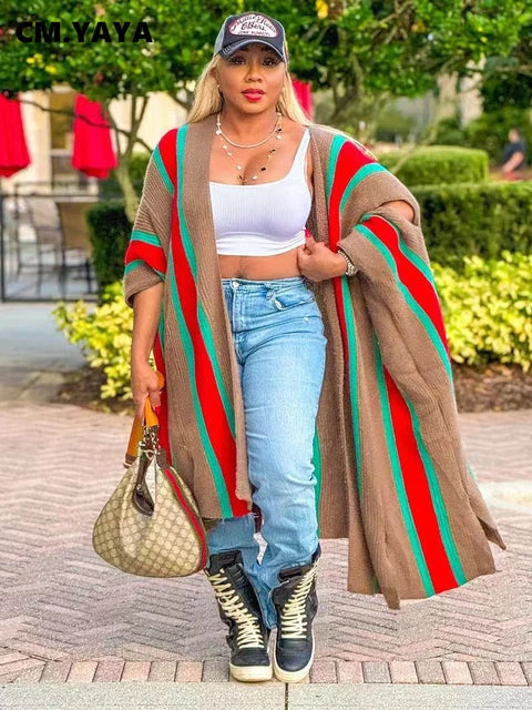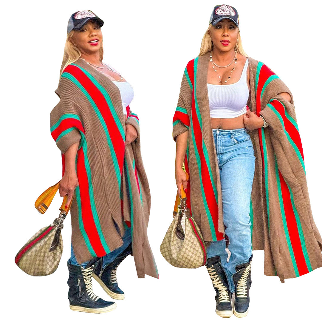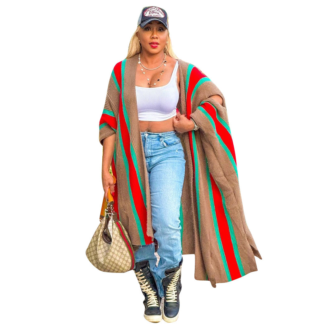 Fashion Women Knit Ribbed Striped Cutout Batwing Sleeve Open Stitch Oversized Sweater and Jumpers Cardigan