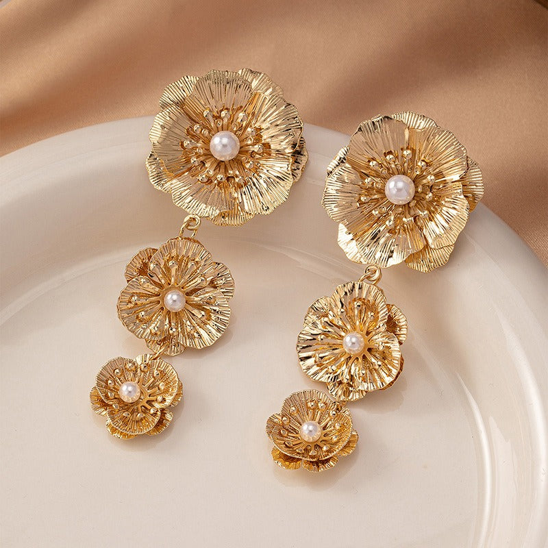 Flower-shaped earrings, European and American popular design, three flower earrings, high-end and elegant earrings