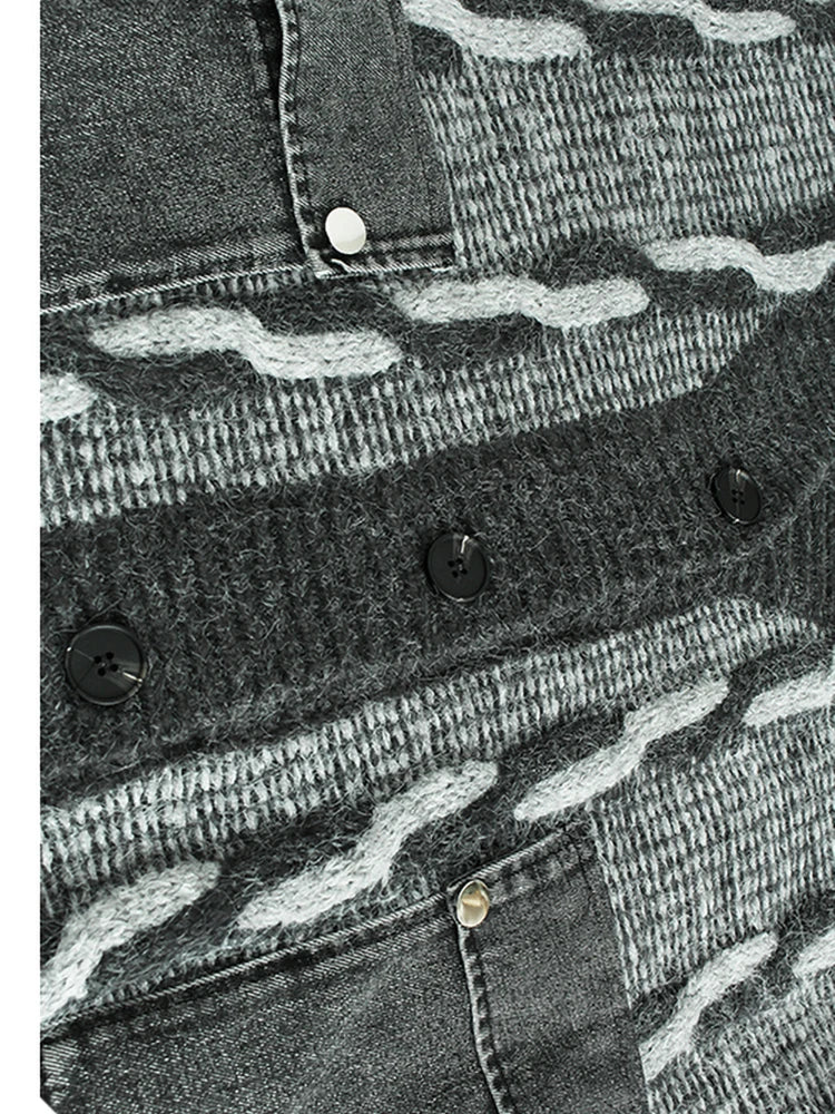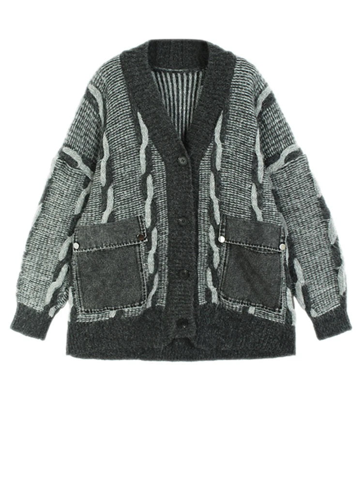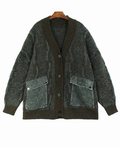 Gray Denim Pocket Big Size Knitting Cardigan Sweater V-Neck Long Sleeve Women New Fashion Tide Spring Autumn