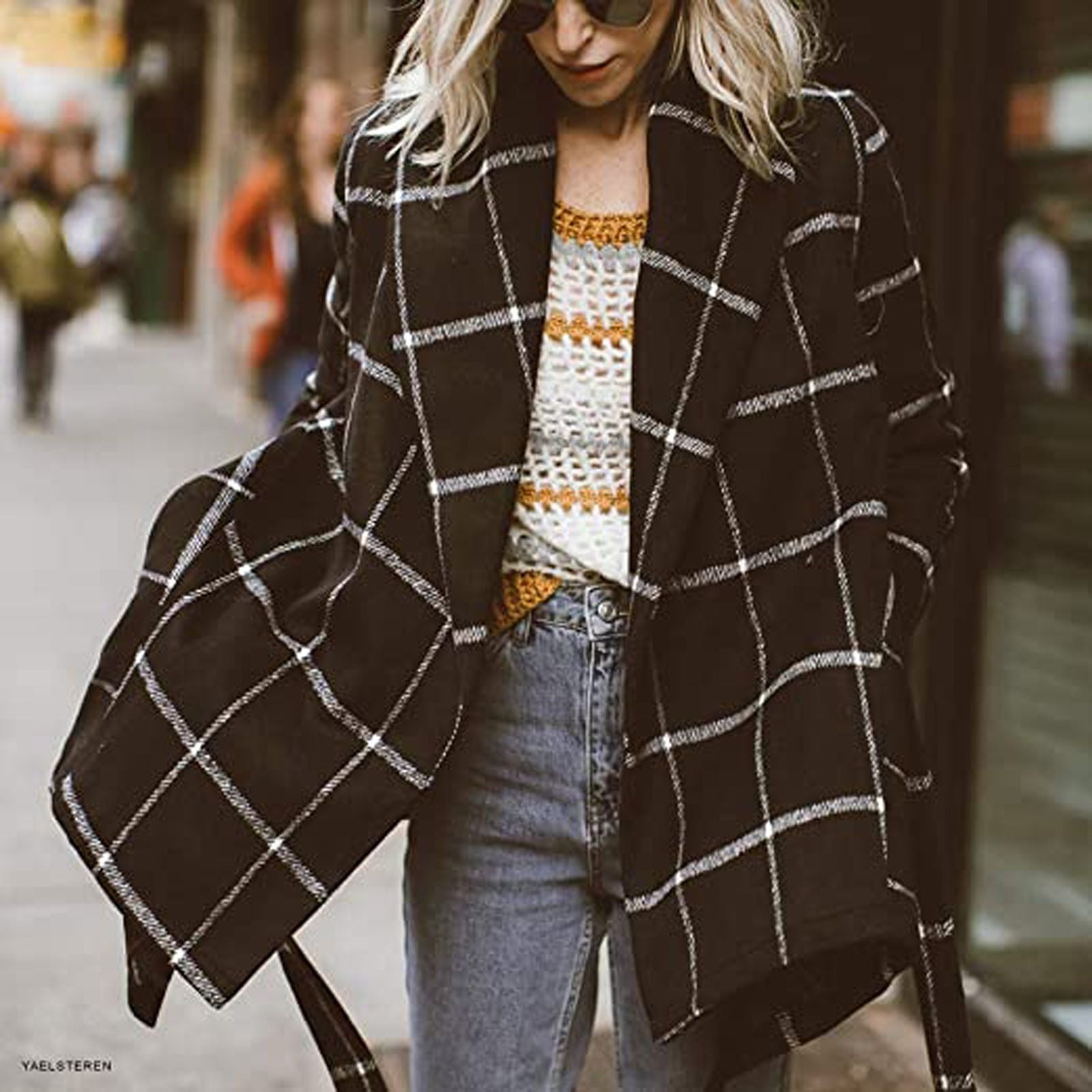 Lace up plaid long sleeved woolen coat mid length windbreaker for women