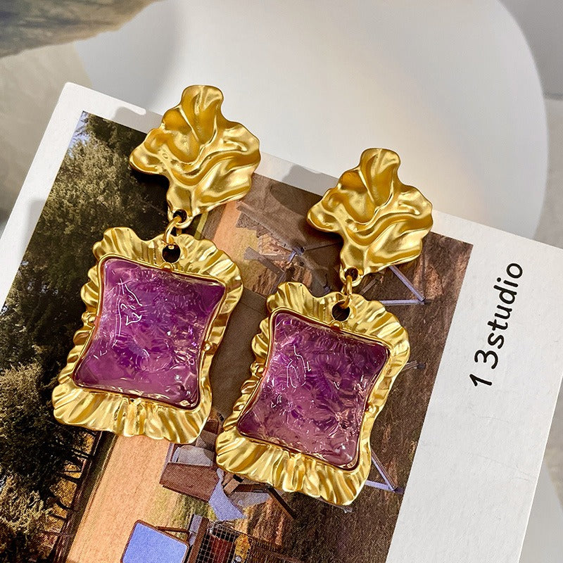 Lava earrings, irregular purple square glazed crystal earrings, retro temperament earrings