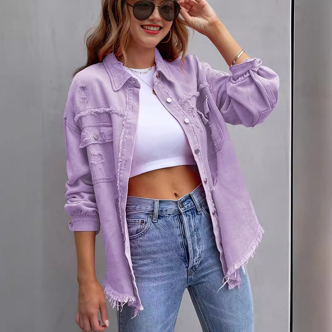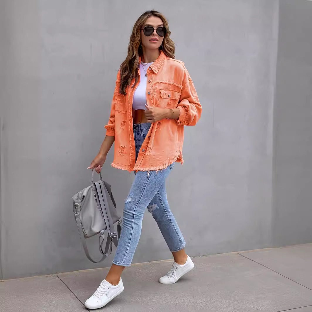 Leisure medium length denim jacket for women's loose and distressed patchwork jacket