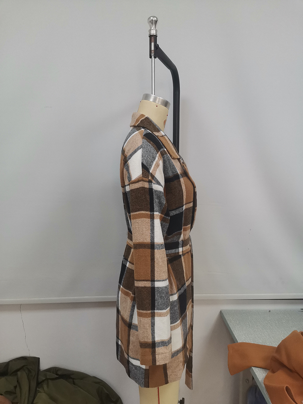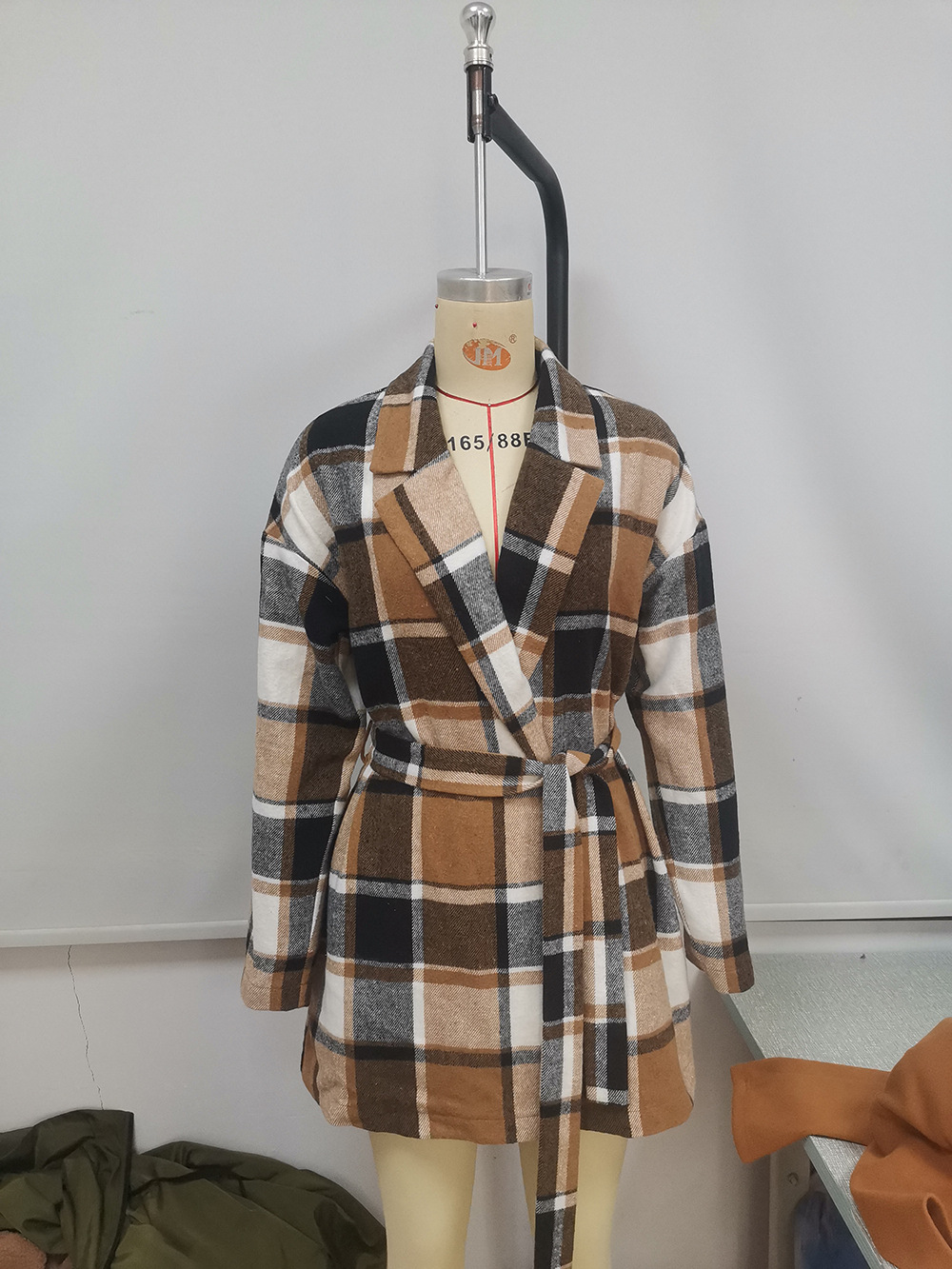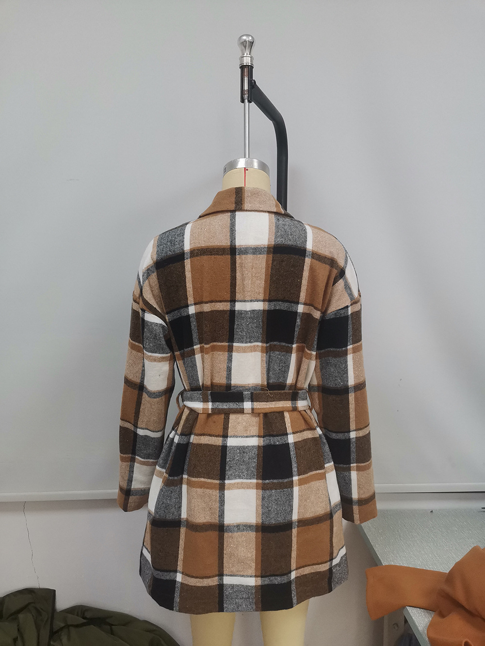 Leisure plaid lapel belt trench coat woolen loose plaid shirt cardigan coat