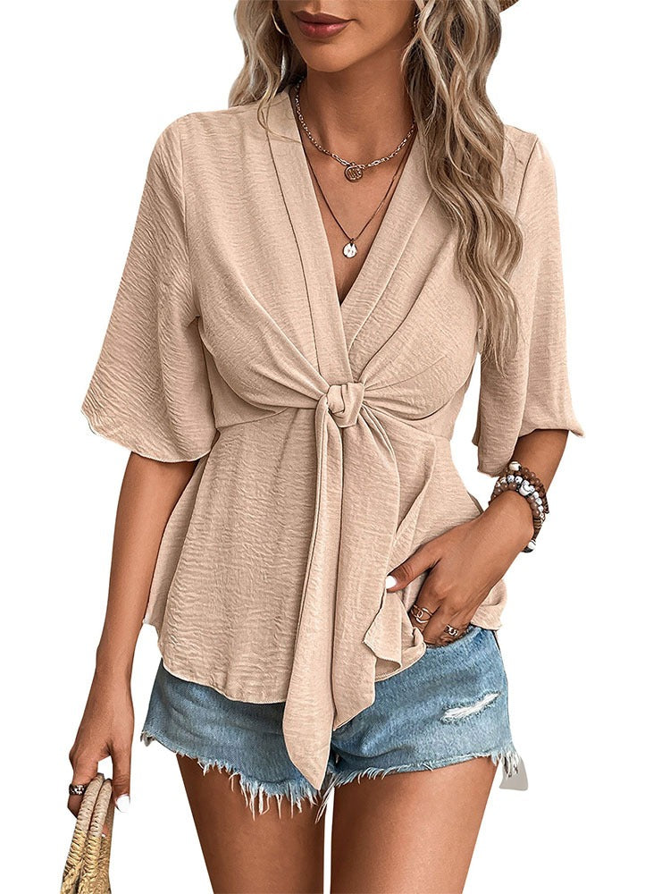 New European and American summer women's clothing wrapped in V-neck solid color shirt for women