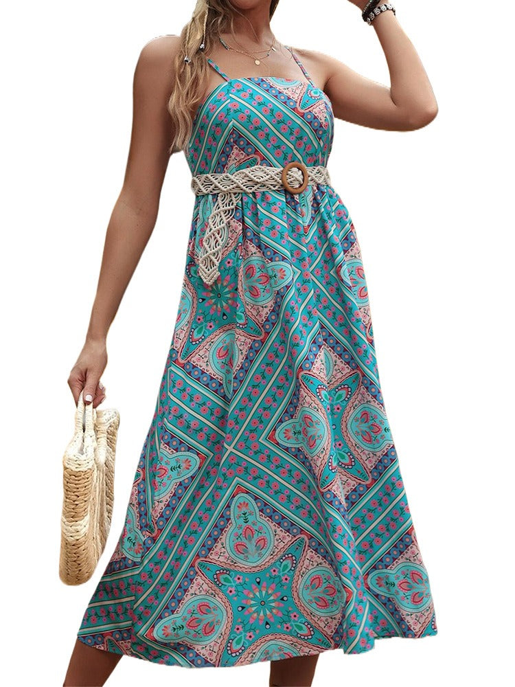 New European and American Summer Women's Ethnic Style Printed Strap Dress