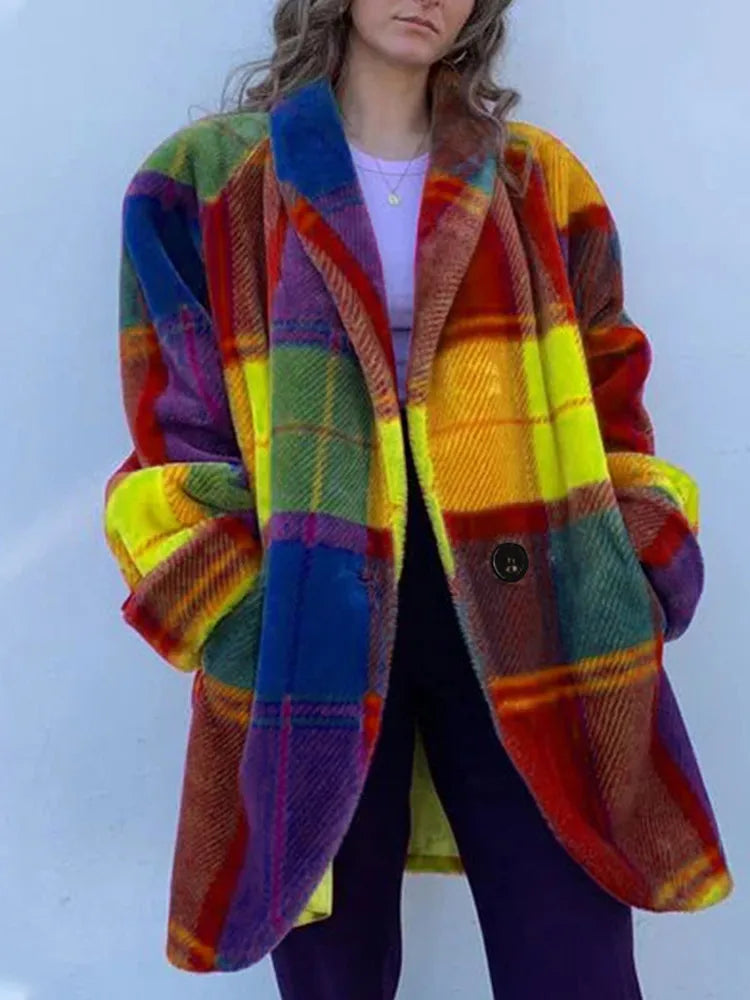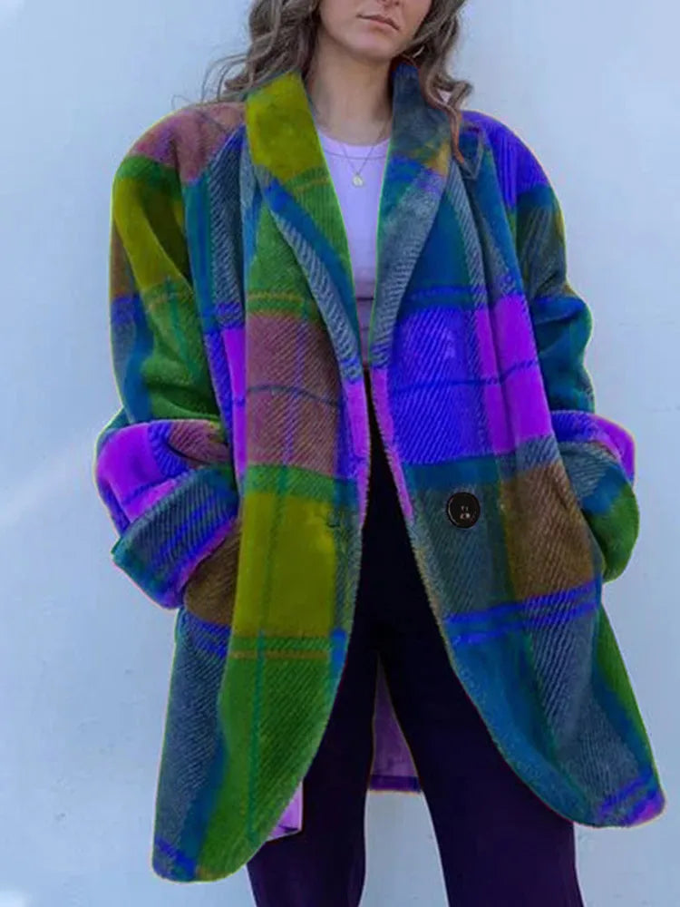 Panelled Plaid Women Jacket Long Sleeve Pocket Single Breasted Casual Female Coat Spring V-neck Elegant Lady Overcoat