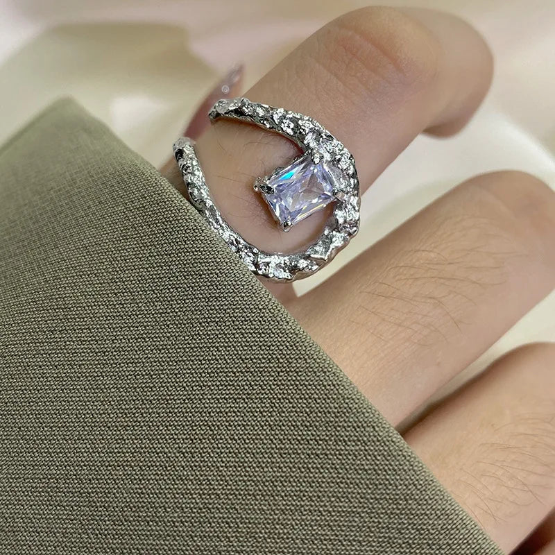 Silver Color Simple Irregular Hollow Geometric Crystal Zircon Ring Female Fashion Temperament Hip-hop Classic Gift