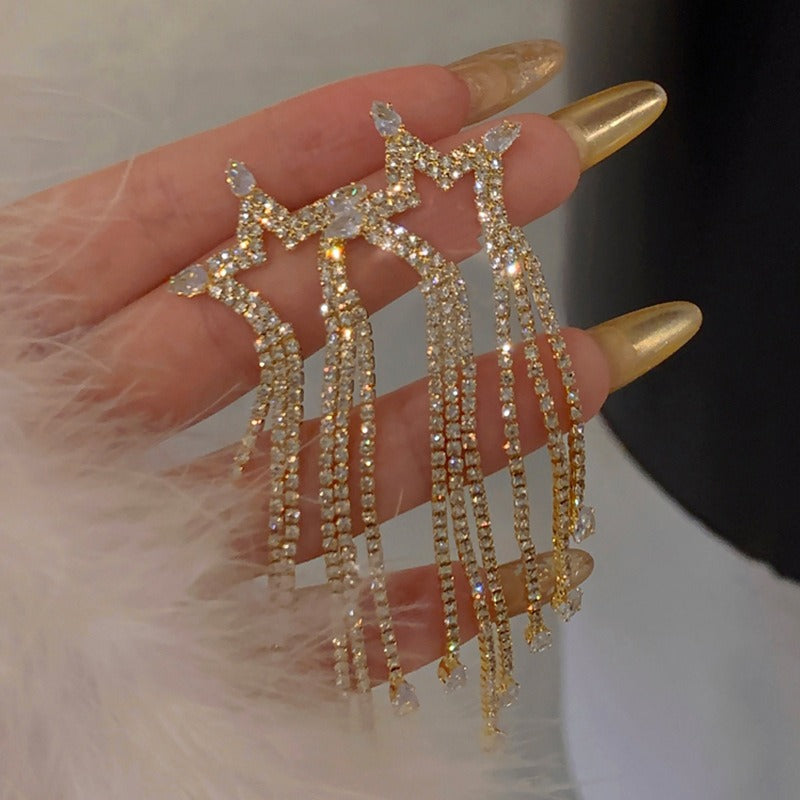 Silver Needle Diamond Zircon Five pointed Star Long Tassel Earrings French style Earrings