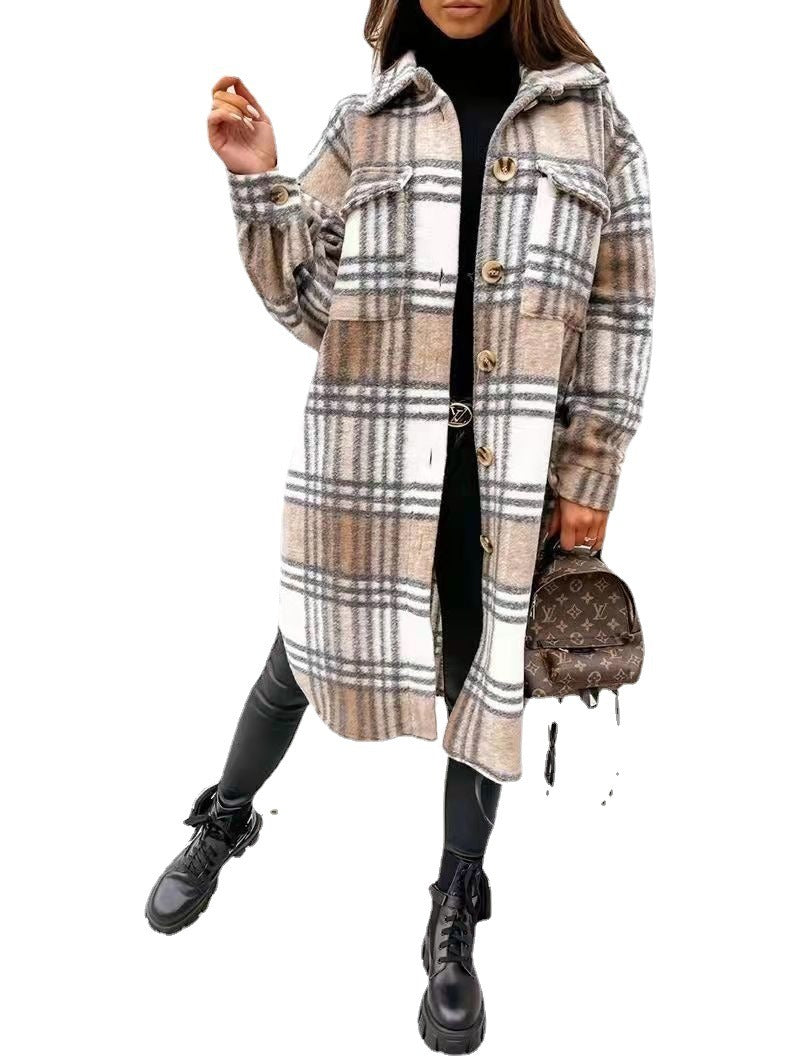 Spring And Autumn New Women's Plaid Brushed Medium Long Woolen Coat