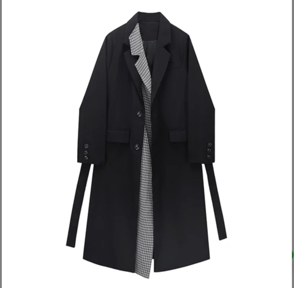SuperAen Vintage Trench Coat Plaid Single-breasted Stitching Loose Temperament Coat Woman Black Coats for Women