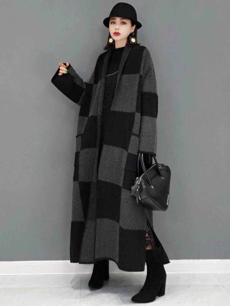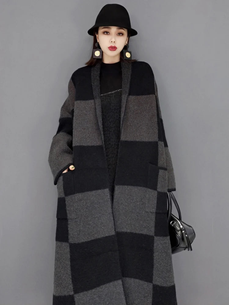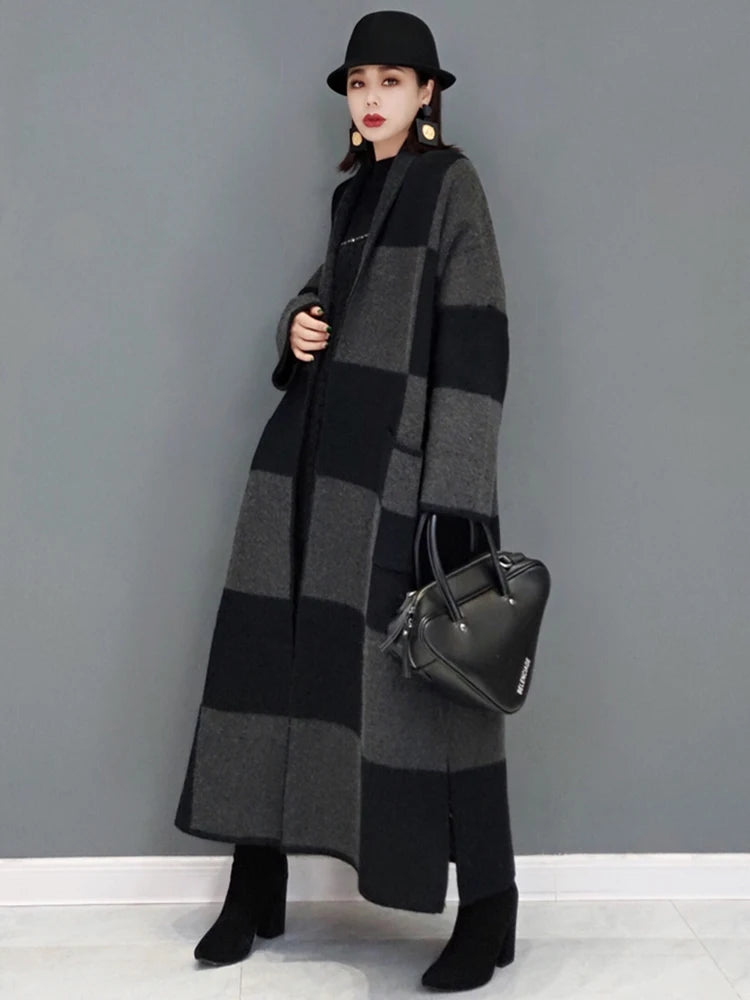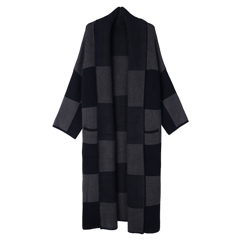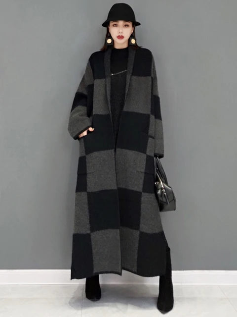 Winter New Knitting Trench For Women Vintage Fashion Plaid Loose Thicken Sweater Windbreaker Female Coat