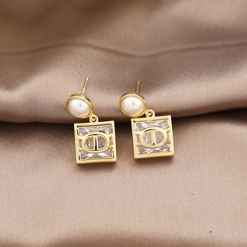 Zircon Pearl Square Earrings with High Grade, Light Luxury Style and Silver Needle Earrings